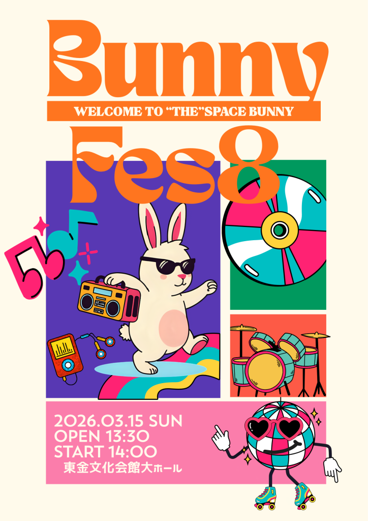 NEWS Bunny Fes 8 2026/01/14category:News 2026/3/15 @東金文化会館大ホール open 13:30 / start 14:00 ※観覧無料ですが入場整理券が必要です。ご希望の方はお電話で承ります。 前へ 一覧